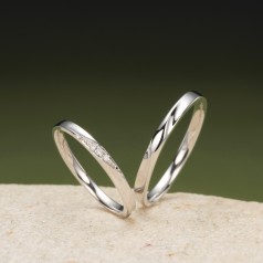 シンプルなストレートのラインに動きをつけた、立体感のあるデザインの結婚指輪。流れに沿ったダイヤモンドが上品に輝きます。