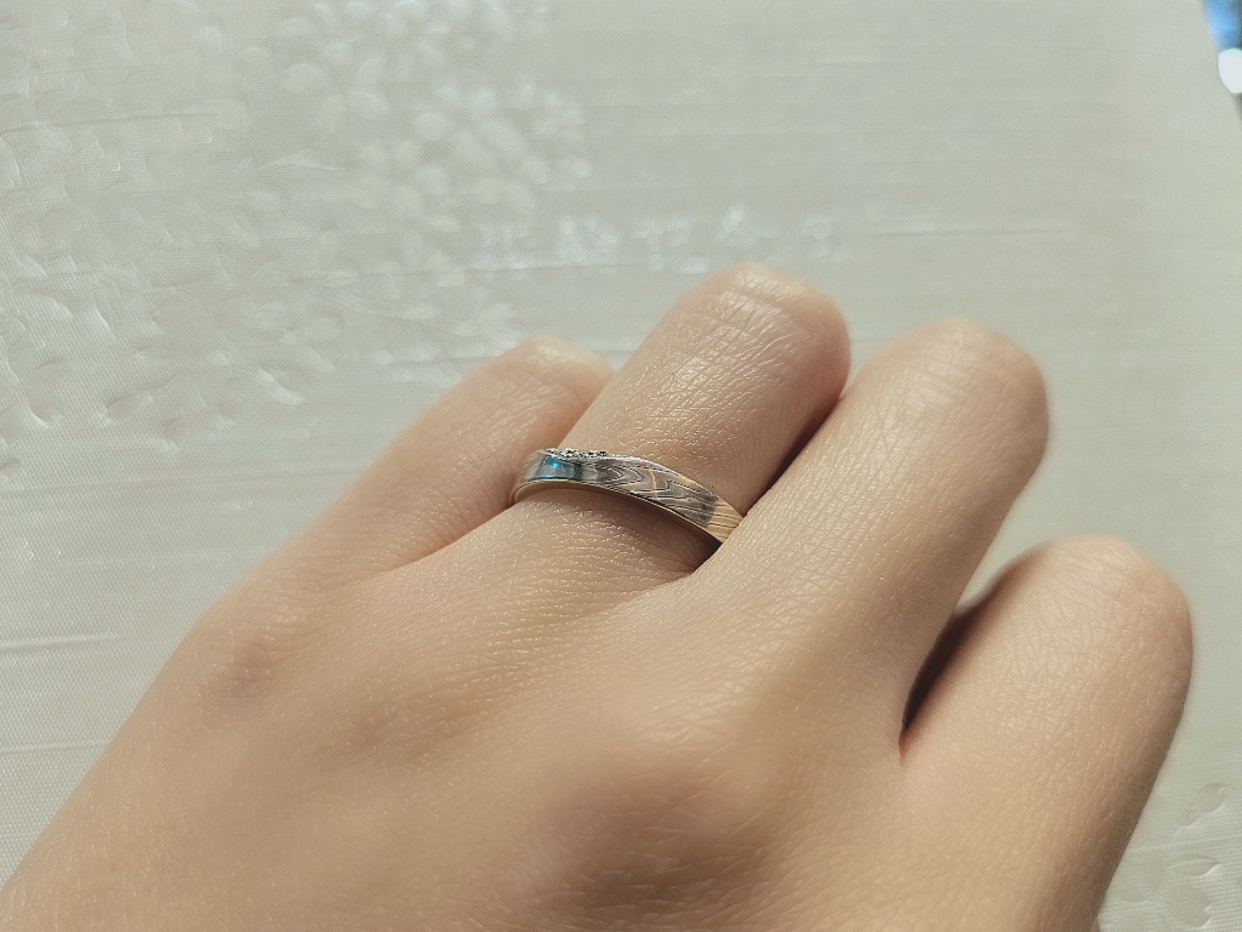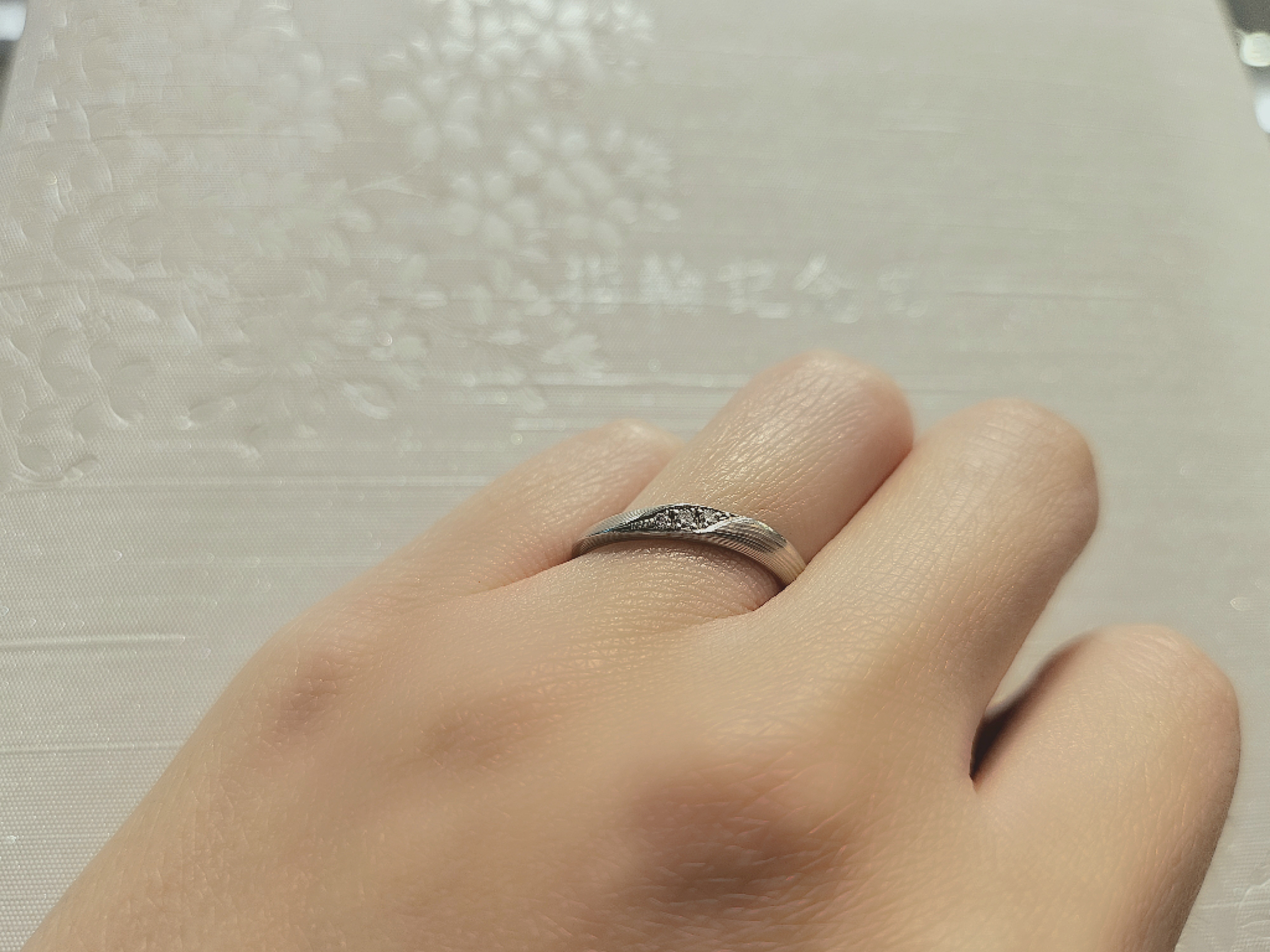 満月の月明かりに照らされたような輝きを放つ、ゆるやかなウェーブライン。プラチナが素材で入ったシンプルながらの木目模様が美しく映えるデザインです。