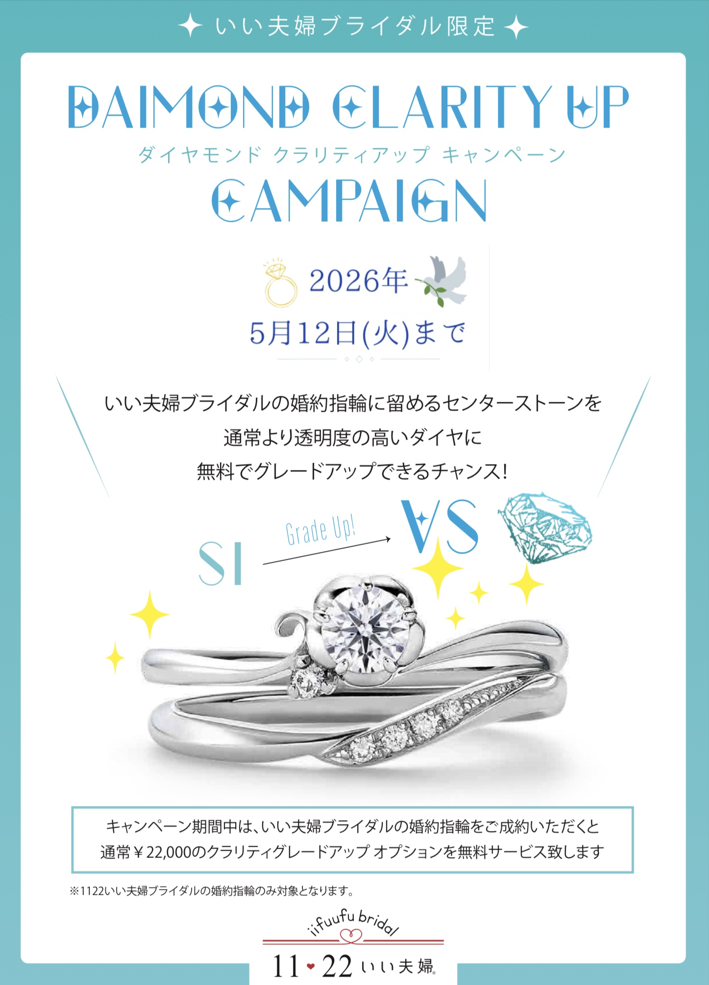 キャンペーン期間中、いい夫婦ブライダルの婚約指輪をご成約頂いた方にクラリティグレードアップオプションを無料でサービスいたします。